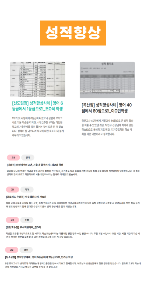 실제로 한 구로고 2학년 학생은 “문제집을 3권 풀었는데도 70점대였어요. 기출 분석하고 나서 2번 시험 만에 90점 넘었습니다.”라고 말하기도 했습니다.