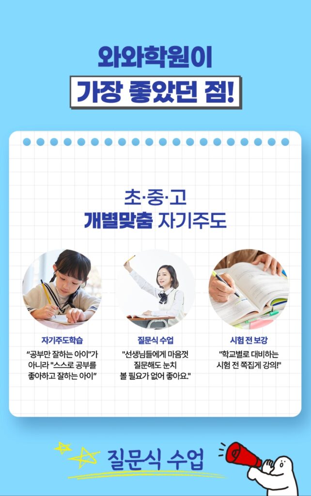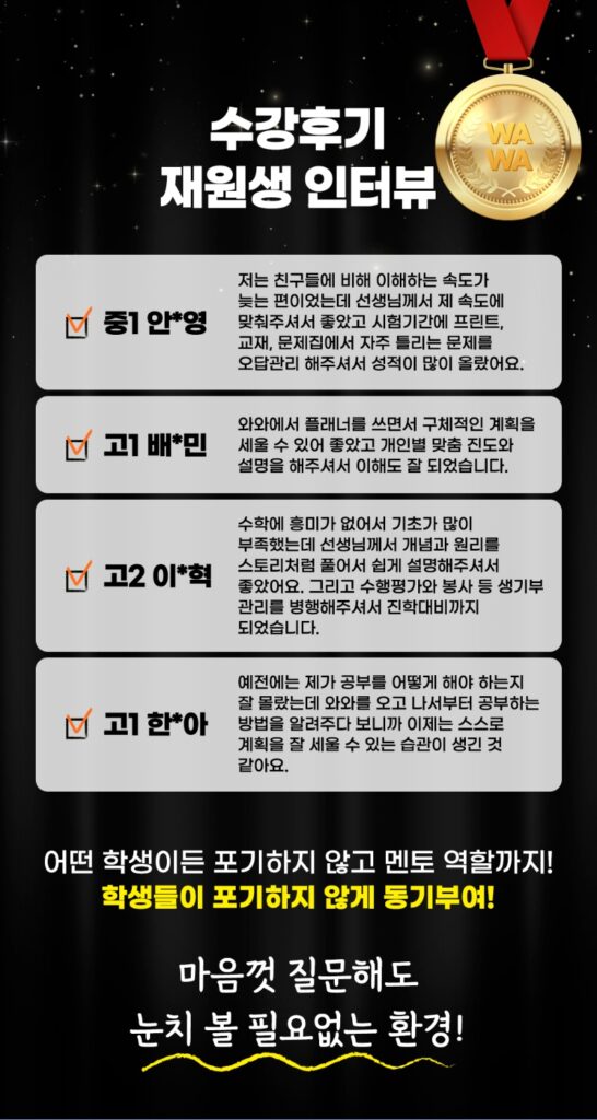뒤로 가기메시지가 발송되었음 상담 받을 전화번호(필수) 경고 학년(필수) 경고 통화가능시간 경고 경고입니다. 문의하기양식 제출 중 와와학습코칭학원 성동광진교육지원청 등록 제 2316호ㅣ초등 90분x3회 21만원ㅣ중등 90분x4회 30만원ㅣ고등 90분x4회 34만원ㅣ 수업 횟수 및 교습시간 단위에 따라 교습비에 차이가 있을 수 있어요. 카톡 상담 문의하기